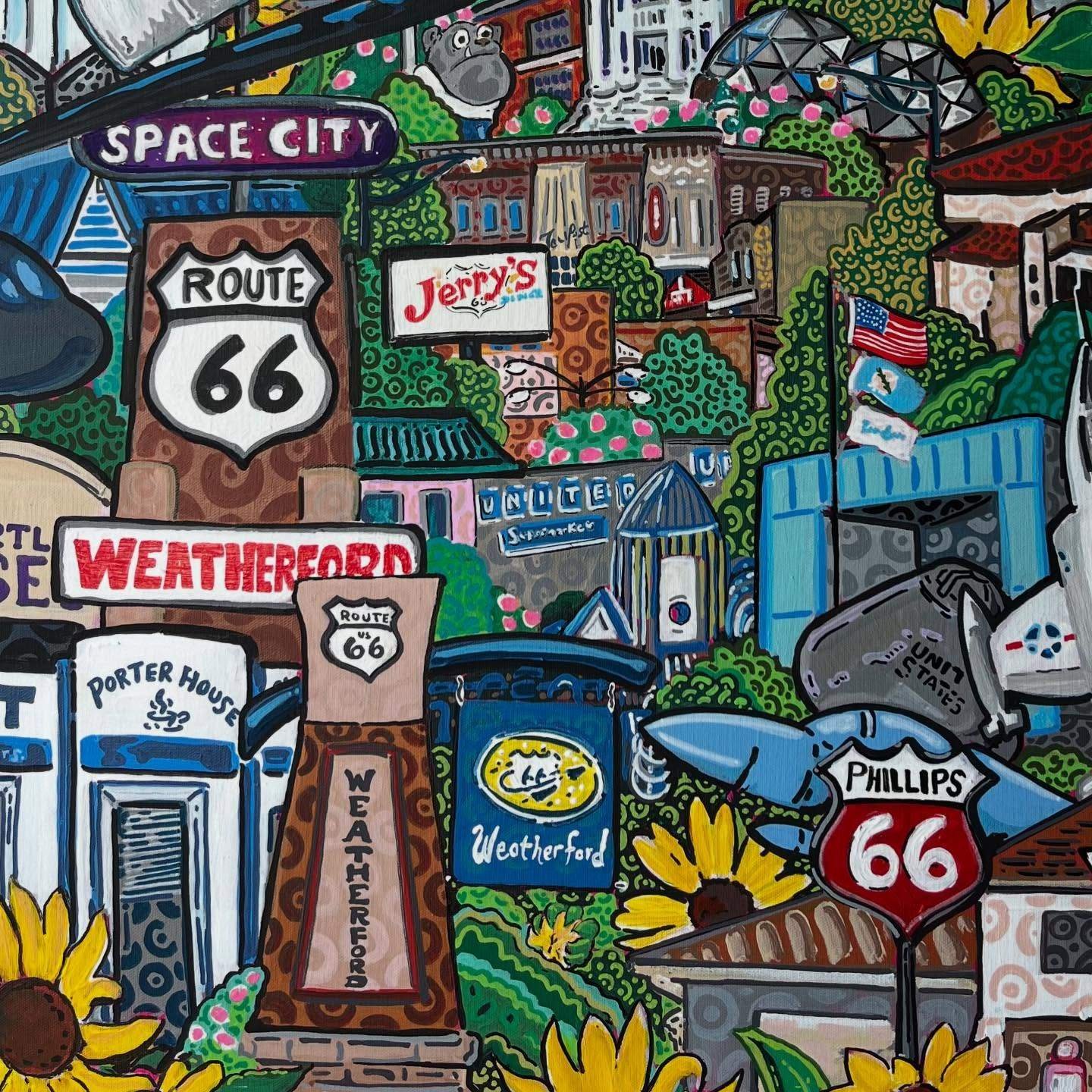 This postcard captures the spirit of Route 66 in Weatherford as a lively crossroads of history, travel, and local pride. The familiar Route 66 shields and Weatherford signage anchor the scene, while surrounding details—old storefronts, classic diners, fuel branding, and space-age references—hint at the town’s layered identity along the Mother Road. There’s a sense of motion and memory here, where road trips, small businesses, and roadside Americana all overlap. The bright sunflowers and playful composition soften it into something nostalgic and warm, presenting Weatherford not just as a stop on Route 66, but as a place where past journeys and hometown character continue to meet.
