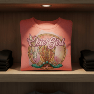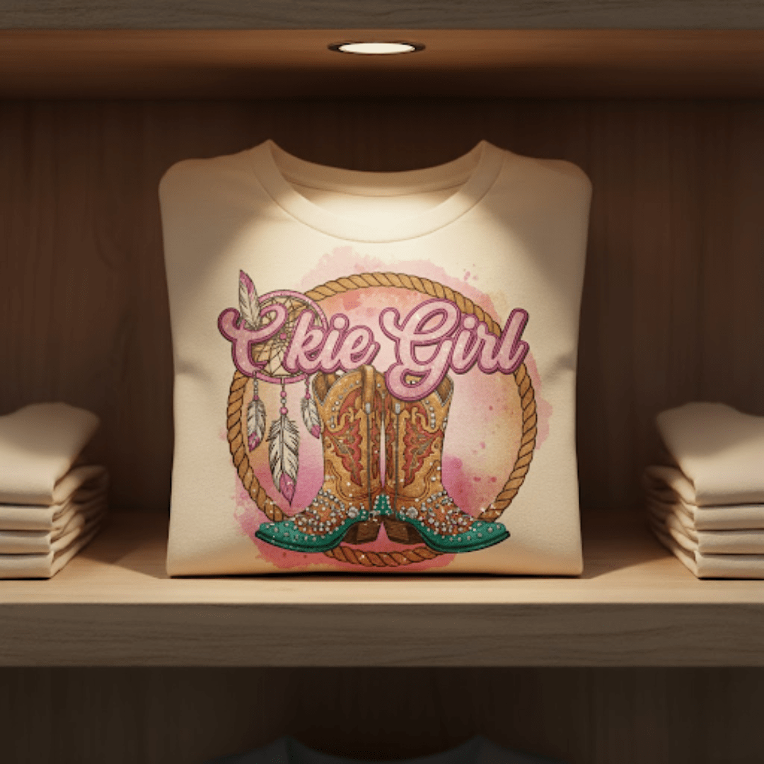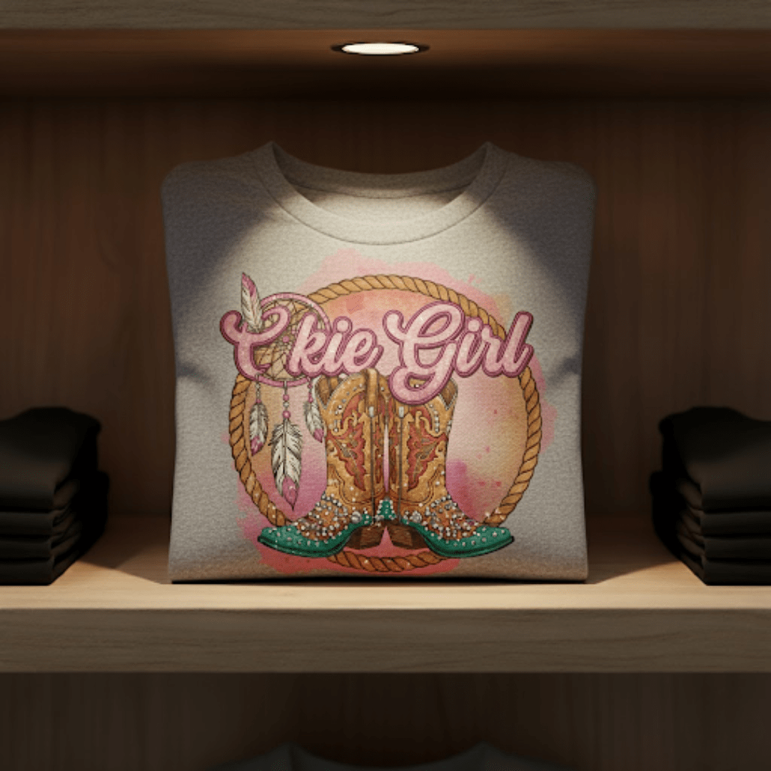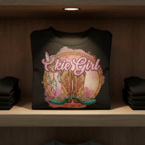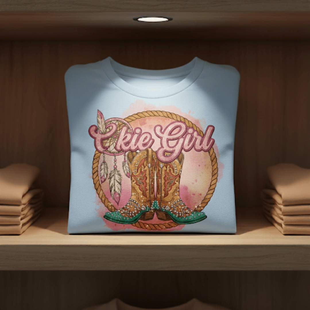 Celebrate your Oklahoma pride and cowgirl spirit with the Okie Girl Glam Western Tee! This eye-catching design features a dazzling blend of Western and bohemian flair, perfect for any girl who’s proud to be an Okie.