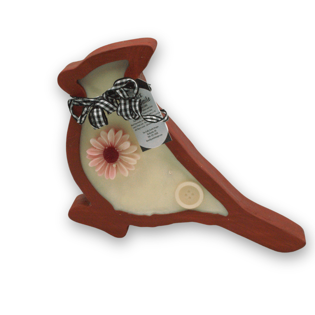 Add a splash of rustic charm to your home with this beautiful cardinal-shaped candle. The vessel is crafted from wood and finished in a classic red, creating a striking silhouette. Filled with hand-poured white wax, this piece is uniquely accented with a decorative pink flower, a vintage-style button, and a black and white gingham bow. Whether used as a festive holiday accent or a year-round gift for bird lovers, this cardinal candle brings a warm, farmhouse feel to any space.