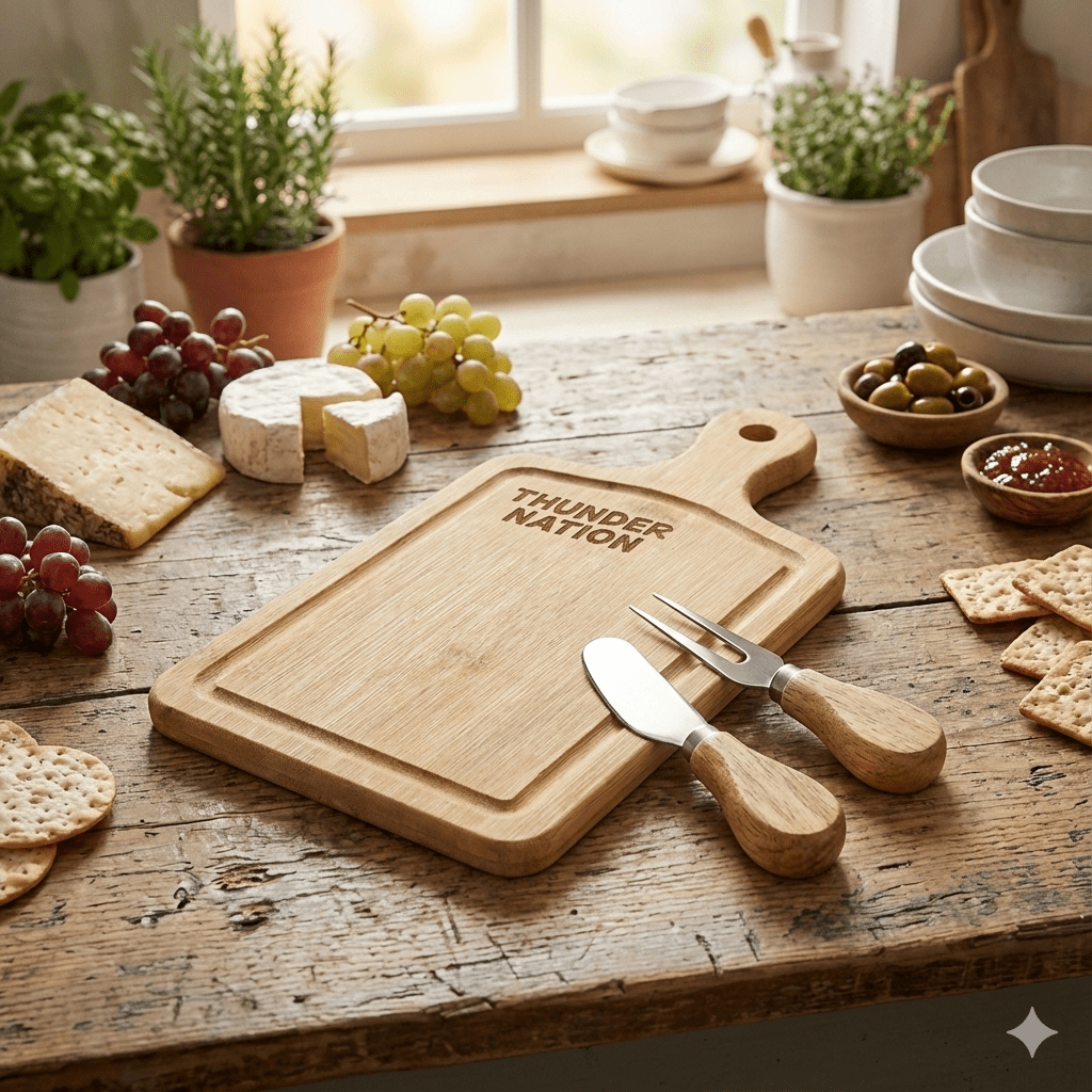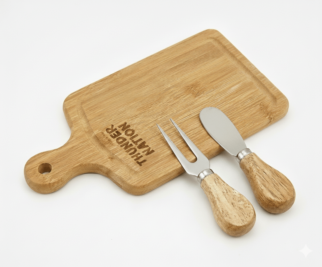 Get ready to “Thunder Up” for the big game! This durable wooden cheese board is the perfect teammate for your game day appetizers. Laser-engraved with “THUNDER NATION,” it’s designed for the ultimate basketball fan who loves to host. The compact size makes it ideal for courtside snacks on the coffee table, and it comes equipped with a matching cheese fork and spreader knife. It’s a slam dunk addition to any watch party.