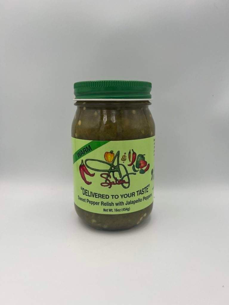 Warm Sweet Pepper Relish is made with a Jalapeno. It has a sweet up front then it will go to the Pepper.
